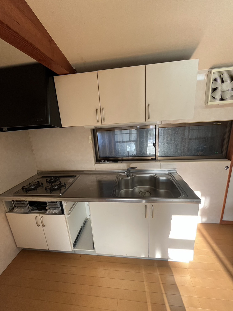 解体前は、キッチン設備や収納棚などが残った状態で、